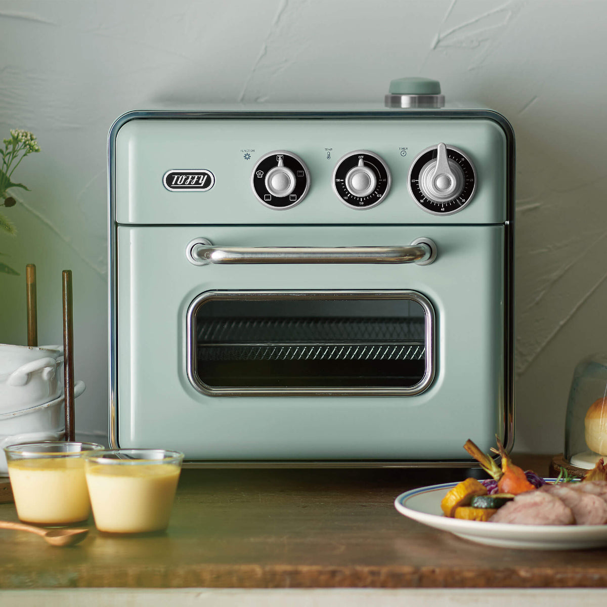 どこかレトロなダイヤル操作と、淡い色使いがたまらないコンパクトなトースター。油を使わず揚げ物ができる優れもので、ヘルシー志向な方にもぴったり。かわいい。